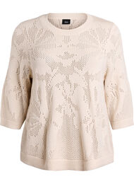 Neulottu pusero pehmeästä puuvillasekoitteesta, jossa on avointa kukkakuviota, luoden naisellisen ja kevyen ilmeen. Puserossa on pyöreä pääntie, 3/4-hihat ja tavallinen istuvuus.