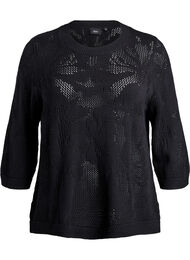 Neulottu pusero pehmeästä puuvillasekoitteesta, jossa on avointa kukkakuviota, luoden naisellisen ja kevyen ilmeen. Puserossa on pyöreä pääntie, 3/4-hihat ja tavallinen istuvuus.