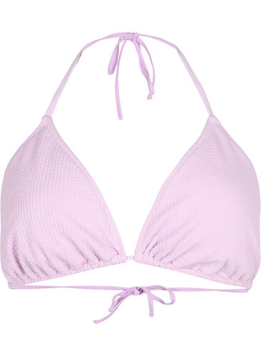 Kiinteä kolmiomallinen bikiniyläosa, jossa on kaunis kreppipinta ja kapeat nauhat, jotka solmitaan taakse. Bikiniyläosa on vuorattu verkkokankaalla tuen ja mukavuuden takaamiseksi.
