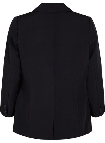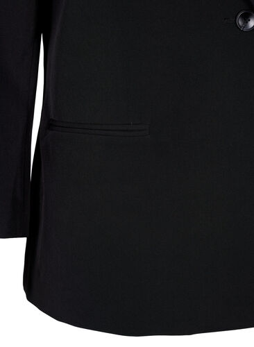 Bleiseri, jossa on klassinen kaulus ja takinliepeet, sekä halkio takana. Bleiseri suljetaan yhdellä napilla, siinä on koristetaskut ja se on valmistettu mukavasta ja joustavasta materiaalista.
