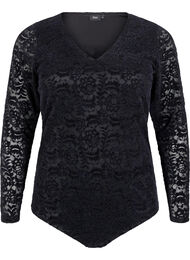 Tyylikäs vartalonmyötäinen body pehmeää veluuripitsiä. Torsossa vuori, pitkät läpikuultavat hihat ja V-pääntie. Korkealle nousevat jalantiet ja piilotetut painonapit haaroissa.