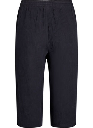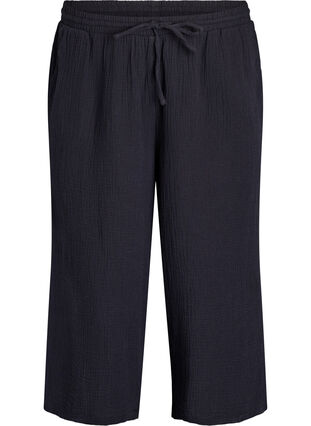 Culotte-housut 100 % puuvillamusliinia – pehmeästä ja hengittävästä kuvioidusta kankaasta. Housuissa on korkea vyötärö, jossa on kuminauha ja kiristysnauha, sivutaskut ja väljä, mukava 7/8-pituinen istuvuus.