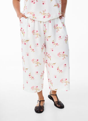 Väljät culottes-housut upealla kuosilla. Niissä on joustava vyötärö ja ne on valmistettu 55% kierrätetystä polyesteristä.