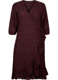 Kaunis midi-mekko, jossa on kietaisumalli ja 3/4-hihat. Mekossa on kuvioitu kangas, koristeellinen röyhelöreunus ja vyö vyötäröllä naisellisen siluetin luomiseksi.