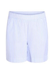 Raidalliset 100 % puuvillaa olevat shortsit sivutaskuilla. Shortseissa on korkea vyötärö, joustava vyötärönauha ja suora, mukava istuvuus.