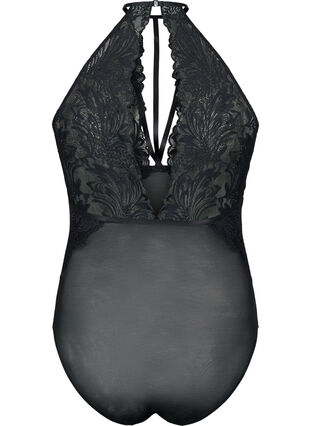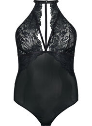 Erittäin naisellinen body, jossa on niskasta suljettava halterneck-pääntie. Tässä verkko-pitsibodyssä on kauniit leikkaukset ja nauhayksityiskohta edessä sekä piilotetut nepparit haarakiilassa.