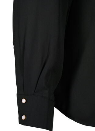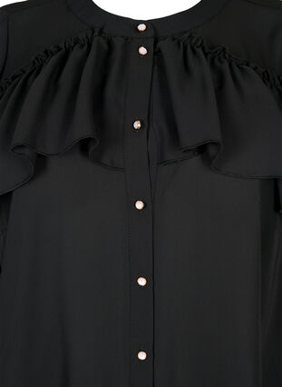 Pyöreäkauluksinen paitapusero, jossa on nappisuljenta ja kauniit helminapit. Paitapuserossa on leveä röyhelökoristelu edessä ja takana.