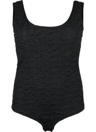 Tiukasti istuva bodystocking kuvioidusta jerseystä. Pyöreä pääntie, leveät olkaimet ja piilotetut painonapit haaraosassa.