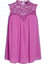 Tyylikäs hihaton juhlatoppi kevyestä sifongista pehmeällä viskoosivuorella. Topissa on kaunis, koristeellinen virkattu yläosa, pyöreä pääntie, pieni napillinen pystykaulus ja halkiot takana. Väljä istuvuus ja ohuet laskokset luovat ihanan, naisellisen leikkauksen.