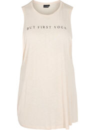 Hihaton treenitoppi pehmeästä viskoosista. Siinä on pyöreä pääntie ja tekstiprintti rinnassa.