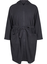 Pehmeä aamutakki vetoketjulla ja hupulla. Aamutakissa on taskut edessä ja vyö vyötäröllä.