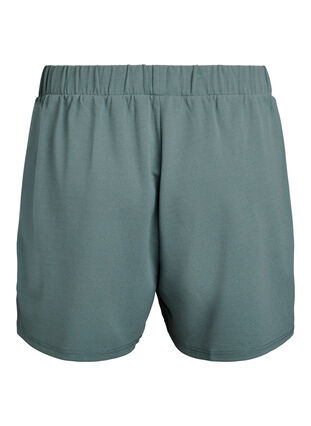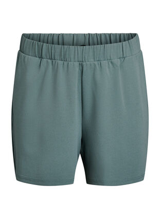 Yksiväriset shortsit, joissa on sivutaskut. Näissä shortseissa on korkea vyötärö, jossa on takana kuminauha, ja shortseissa on väljä istuvuus.
