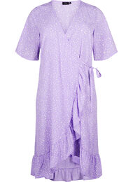Naisellinen kietaisumekkolyhyillä hihoilla ja v-pääntiellä. Mekko on valmistettu kevyestä materiaalista, jossa on 55% kierrätettyä polyesteriä ja kaunis kuosi. Siinä on nauha vyötäröllä sekä kauniit röyhelöyksityiskohdat, jotka täydentävät naisellisen ilmeen.