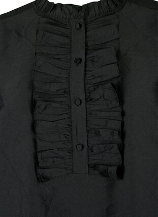 Kiiltävä paitapusero, jossa on normaali istuvuus ja naiselliset röyhelöt kauluksessa ja rinnassa. Paitapuserossa on pitkät hihat, joissa on mansetit ja pienet laskokset olkapäillä, jotka luovat hieman puhvivaikutelmaa.