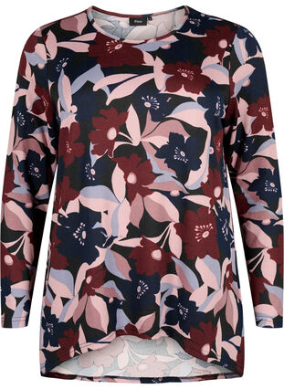 Kauniisti ja yksinkertaisesti kuvioitu pusero, jossa on pitkät hihat ja pyöreä pääntie. Puseron takaosa on pidempi.