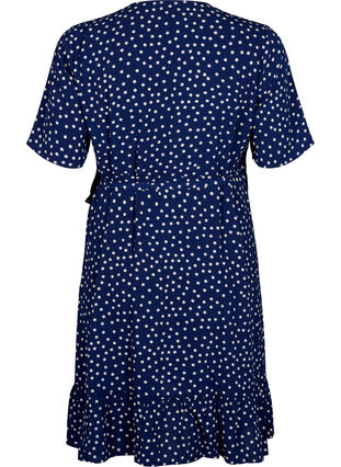 Naisellinen kietaisumekko lyhyillä hihoilla ja v-pääntiellä. Mekko on valmistettu kevyestä materiaalista, jossa on 50% kierrätettyä polyesteriä ja kaunis kuosi. Siinä on nauha vyötäröllä ja kaunis röyhelö, joka viimeistelee naisellisen ilmeen.