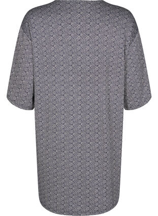 Lyhyt, naisellinen mekko kuosilla, valmistettu kevyestä ja mukavasta viskoosisekoituksesta. Mekossa on pyöreä pääntie, 3/4-pituiset leveät hihat ja normaali istuvuus.