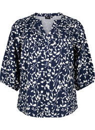 Kaunis kauttaaltaan kuvioitu pusero joka on 100% puuvillaa. Puserossa on normaali istuvuus ja ¾-mittaiset hihat joustavilla hihansuilla. Puserossa on lisäksi röyhelöllä koristeltu V-pääntie jossa on lyhyt nappikiinnitys.