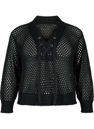 Tyylikäs pitsikuvioitu neule. Neulepuserossa on V-pääntie, nauhakoristelu, sekä leveät ribatut hihansuut ja helma.