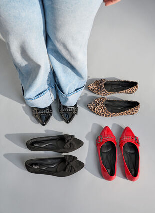 Tyylikäs ballerina, jossa on terävä kärki ja leveä remmi koristeellisilla niiteillä. Kengät on valmistettu kiiltäväpintaisesta keinonahasta ja suunniteltu leveälestisille jaloille. Pohjassa on lisätuki kaaren ja kannan kohdalla, mikä takaa optimaalisen mukavuuden koko päiväksi.