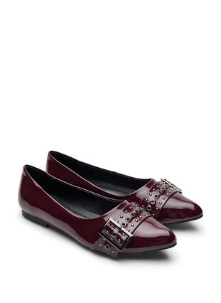 Tyylikäs ballerina, jossa on terävä kärki ja leveä remmi koristeellisilla niiteillä. Kengät on valmistettu kiiltäväpintaisesta keinonahasta ja suunniteltu leveälestisille jaloille. Pohjassa on lisätuki kaaren ja kannan kohdalla, mikä takaa optimaalisen mukavuuden koko päiväksi.
