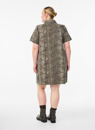 Lyhyt paitamekko 100% puuvilladenimistä käärmeprintillä ja pestyllä viimeistelyllä. Tyylissä on klassinen kaulus, lyhyet hihat, täyspitkä nappikiinnitys ja sivutaskut. Istuvuus on hieman A-linjainen, mikä antaa mekon laskeutua kauniisti vartalon yli.