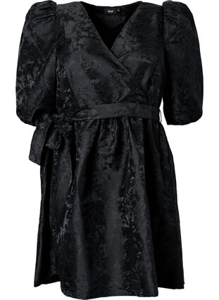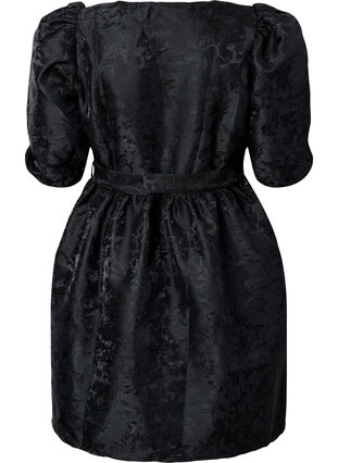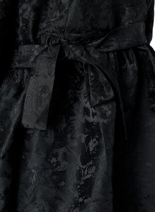 Elegantti mekko kauniista jacuard-materiaalista. Siinä on yhteensopiva vyö vyötäröllä sekä piilotettu vetoketju sivulla. 3/4-hihojen joustokantti ja rypytys tekevät niistä puhvihihamaiset.