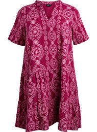 Feminiininen mekko ihanan hengittävästä musliinikankaasta, joka on valmistettu 100% pehmeästä puuvillasta. Mekossa on lyhyet hihat, V-pääntie ja alaosan saumat, jotka antavat kauniin laskostuvan ilmeen väljälle A-linjaiselle mallille.