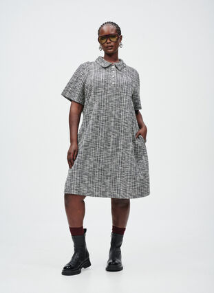 Lyhyt mekko pehmeästä ja joustavasta jerseykankaasta, jossa on graafinen ruutukuvio ja erottuva rakenne. Kankaan pinnalla on mielenkiintoisen teksturoitu tuntu, mikä antaa sille syvyyttä ja luonnetta. Tyylissä on lyhyet hihat, pystykaulus ja puolipitkä nappilista neljällä koristeellisella napilla, joissa on hienovarainen glitter-efekti. Mekon malli on hieman A-linjainen ja rento, mikä tekee siitä mukavan sekä arkeen että siistimpiin tilaisuuksiin.
