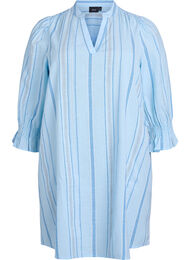 Lyhyt mekko, joka on 100% puuvillaa ja A-linjainen rennolla ilmeellä. Mekossa on pyöreä pääntie V-halkiolla, 3/4-hihat smokkauksella ja röyhelöreunuksella, sekä kudottu raidallinen kuvio pehmeissä kontrastiväreissä. Pehmeä puuvillalaatu on kevyesti teksturoitua, mikä tekee mekosta täydellisen lämpimiin kesäpäiviin.