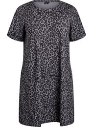 Lyhyt T-paitamekko pyöreällä kaula-aukolla, lyhyillä hihoilla ja rennolla istuvuudella. Mekko on valmistettu pehmeästä ja joustavasta puuvillatrikoosta ja on saatavilla sekä leopardikuosina että camokuviona.