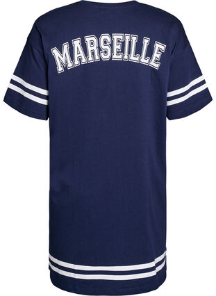 Lyhyt T-paitamekko 100% puuvillasta rentolla istuvuudella ja sporttisella tyylillä. Mekossa on pyöreä kaula-aukko ribatulla reunuksella, lyhyet hihat ja yhteensopivat raitayksityiskohdat hihoissa ja helmassa, mikä täydentää yhtenäistä, urheilullista tyyliä. Painettu pelinumerot koristavat rintaa, kun taas isompi tekstiprintti selässä viimeistelee rennon designin.