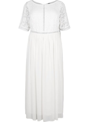 Kaunis lyhythihainen maksimekko, jossa on venepääntie ja syvään uurrettu selkä. Mekossa on ihonmyötäinen yläosa kauniilla pitsikoristuksilla sekä kauniisti vyötäröltä levenevä helma, joka laskeutuu kauniisti. Pehmeä alusmekko ja piilovetoketju sivulla.