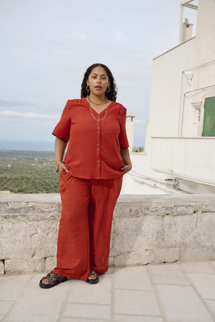 Lyhythihainen paitapusero väljällä istuvuudella, joka on valmistettu 100-prosenttisesti kierrätetystä polyesteristä. Paitapuserossa on V-pääntie, halkio koristeellisilla napeilla sekä rypytys edessä ja takana, mikä luo kauniin laskostuksen.