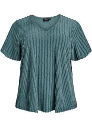 Puserossa on lyhyet hihat, V-pääntie ja normaali istuvuus. Pusero on valmistettu pehmeästä ja joustavasta kankaasta, jonka pinta on raidallinen ja jossa on kevyesti hapsutettuja yksityiskohtia.
