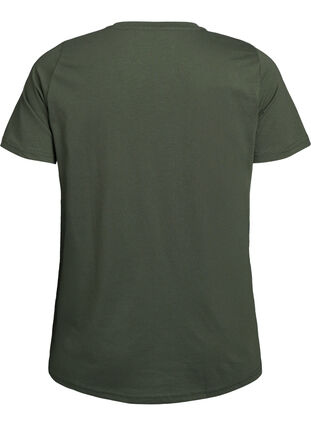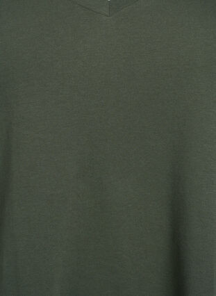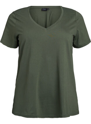 Yksivärinen perus t-paita pehmeästä puuvillasekoitteesta. Siinä on lyhyet hihat ja v-pääntie.