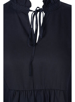 Pehmeä ja naisellinen mekko 3/4 hihoilla, valmistettu 100 % lyocellista (TENCEL™). Mekossa on v-aukko, jossa on nyöri ja kaulus naisellisella röyhelöreunuksella. Laskokset mekon etu- ja takaosassa saavat sen laskeutumaan kauniisti.