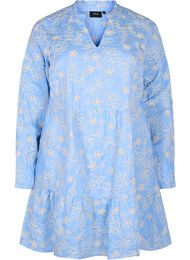 Naisten lyhyt mekko, 100% puuvillaa, kauniilla kukkakirjailuilla, V-pääntiellä ja röyhelökauluksella. Mekossa on pitkät hihat, joissa on hienostunut röyhelöhelma, ja A-linjainen muotoilu saumoilla, jotka tuovat esiin kauniin ja naisellisen ilmeen.
