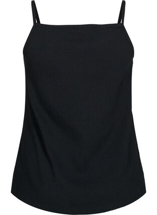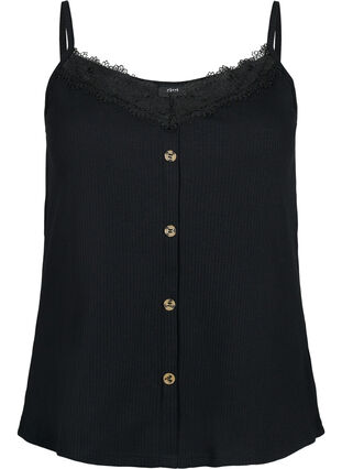 Ohuilla olkaimilla varustettu toppi, joka on valmistettu miellyttävästä puuvillasekoitteesta, jossa on ribattu tekstuuri. Narutopissa on normaali istuvuus, naisellinen pitsireunus kaula-aukossa sekä koristeellinen nappiyksityiskohta etupuolella.