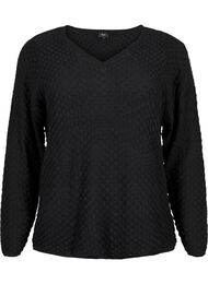 Pitkähihainen villapaita pehmeästä 100 % luomupuuvillasta. Puserossa on V-pääntie ja kaunis neuloskuvio.