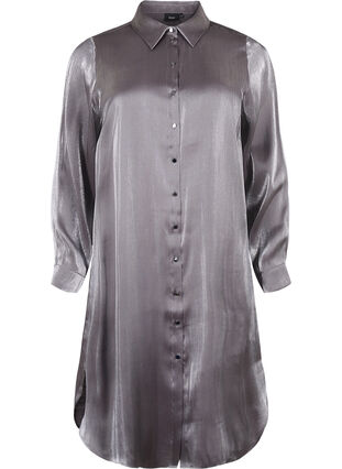 Pitkä hopeanvärinen viskoosipaita klassisella paitakauluksella. Paidassa on napit edessä, pitkät hihat kalvosimilla, normaali istuvuus ja sivuhalkiot.