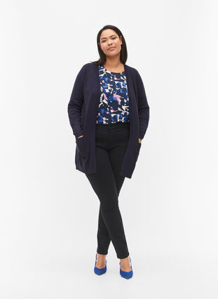 Pitkä neuletakki pehmeästä viskoosisekoitteesta, jossa on mukava ja väljä istuvuus. Neuletakissa on taskut edessä ja resorit.