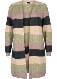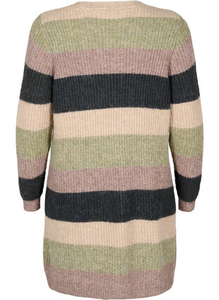 Pitkä, raidallinen, joustinneulottu neuletakki, jossa on väljä istuvuus ja pitkät hihat.