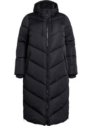 Pitkä toppatakki, jossa huppu ja taskut