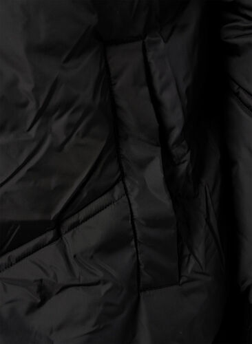 Kierrätetystä polyesteristä valmistettu pitkä toppatakki, jossa on koristeellinen vinottainen tikkaus. Takissa on kaksisuuntainen vetoketju, korkea kaulus, sivutaskut sekä resorireunalla varustetut hihat, jotka suojaavat tuulelta.