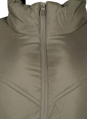 Kierrätetystä polyesteristä valmistettu pitkä toppatakki, jossa on koristeellinen vinottainen tikkaus. Takissa on kaksisuuntainen vetoketju, korkea kaulus, sivutaskut sekä resorireunalla varustetut hihat, jotka suojaavat tuulelta.