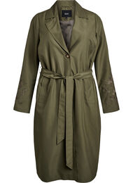 Pitkä trenssitakki, jossa on kauniita kirjailuyksityiskohtia hihoissa, kauluksessa ja halkio takana. Takki suljetaan edestä napeilla, ja siinä on sivutaskut sekä irrotettava vyö vyötäröllä, jonka avulla voit säätää istuvuutta.