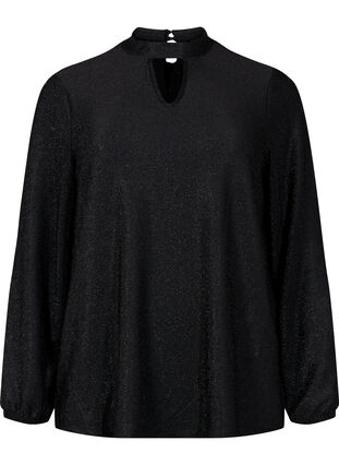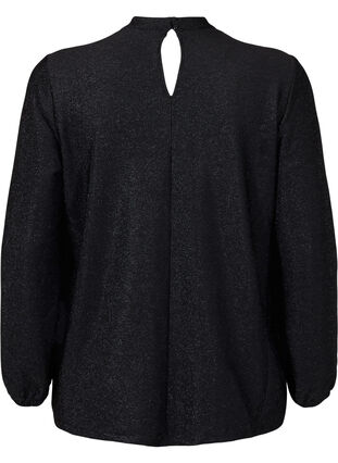 Juhlava glitter-pusero normaalilla istuvuudella ja pitkillä hihoilla, joissa on joustavat hihansuut. Puserossa on pyöreä pääntie V-mallisella yksityiskohdalla, ja se suljetaan napeilla niskan takana.