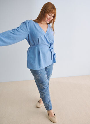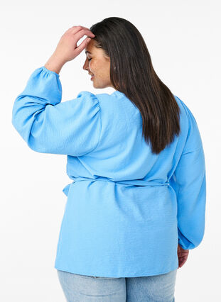 Kaunis pusero naisellisella designilla, jossa on V-pääntie ja pitkät, pussimaiset hihat joustavilla hihansuilla. Pusero on valmistettu kevyestä materiaalista, jossa on 51% kierrätettyä polyesteriä, ja siinä on vyötäröllä solmittava vyö, joka luo kietaisutyylin, ja se on normaalia istuvuutta.