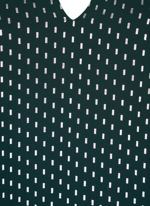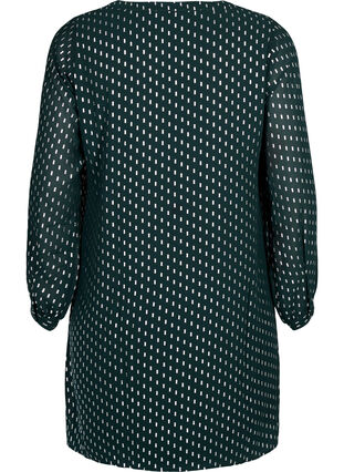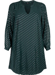 Mekko, jossa on kaunis foliopainatus. Yksinkertainen malli normaalilla istuvuudella ja pehmeällä vuorilla. Mekossa on V-kaulus ja pitkät hihat manseteilla ja napeilla.